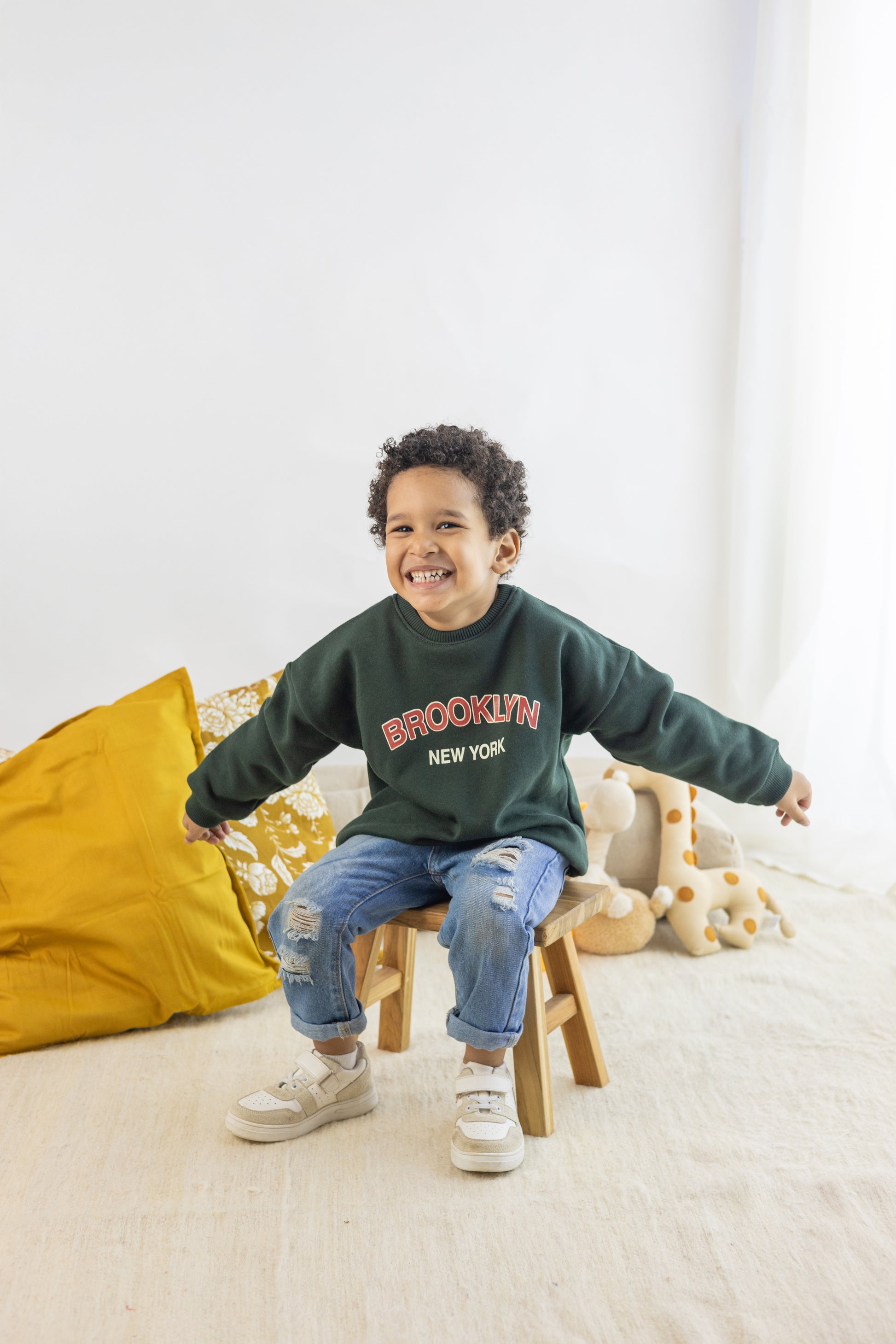 Introducing our Unisex Oversized Brooklyn Sweatshirt, perfect for babies from 6 months to 4 years. Made with a 100% cotton outer surface and soft fleece blended cotton inner lining perfect for both boys and girls. Snuggle your little one in this customized sweatshirt and watch them shine!